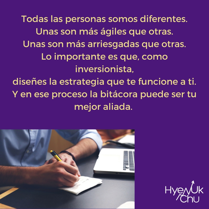 Por último, quisiera decirte algo. Todas las personas somos diferentes. Unas son más ágiles que otras. Unas son más arriesgadas que otras. Lo importante es que, como inversionista, diseñes la estrategia que te funcione a ti. Y en ese proceso la bitácora puede ser tu mejor aliada.